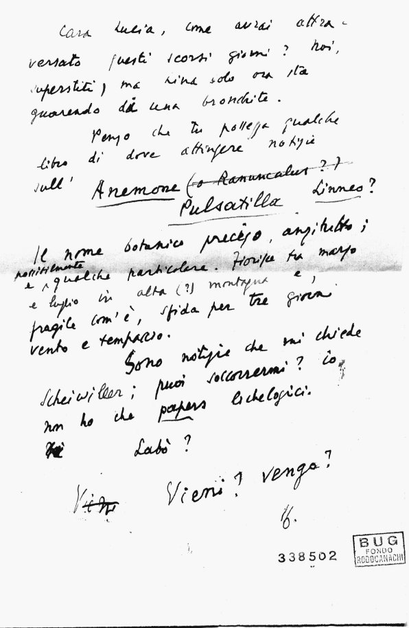 […] Dobbiamo proprio rinunciare a vederla fino ad un’epoca meno occupata; non potrebbe lei ancora una volta sacrificarsi e prendere il treno per Arenzano? Le saremmo molto grati, io specialmente che vivo tra cavoli e carcioffi in perfetta solitudine e non per elezione. Noi siamo sempre in casa la domenica, potrebbe venire domenica, questa o un’altra, a colazione? o un altro giorno se le fa più piacere? Il vento di Arenzano non è forse spaventoso per chi viene da Albisola, e nello studio abbiamo una stufa molto bohème, ma molto utile. Se trova un amico da portare, si ricordi che nella nostra tavola c’è sempre posto per due.
